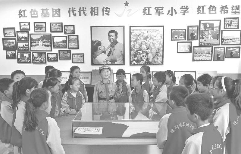 他们都是10岁左右的孩子,他们利用节假日等闲暇时间,了解曾经发生在当地的红色故事,饱含深情地进行宣讲,让大家在这些故事中受到启发和鼓舞。他们是红色基因的传承者,是新时代最可爱的“小网红”。图为铜川市耀州区照金红军小学10岁的陈亦欣身着红军服,正在绘声绘色地给同学们讲述发生在这片土地上的红色革命故事。