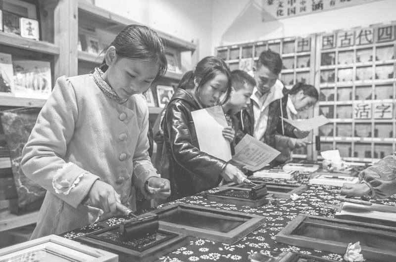 石泉县中坝作坊小镇古朴的石板街道上,古法榨油、活字印刷、陶艺、草鞋编制等传统作坊林立,游客可入内跟手艺人学习并现场操作,感受非遗手工技艺的魅力。图为小学生在石泉县中坝作坊小镇体验活字印刷。