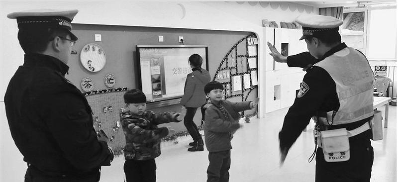 12月4日,汉中市公安局交警支队二大队五中队民警来到市幼儿园,为小朋友们上了一堂生动的交通安全知识课。图为民警为小朋友作交通指挥手势示范。