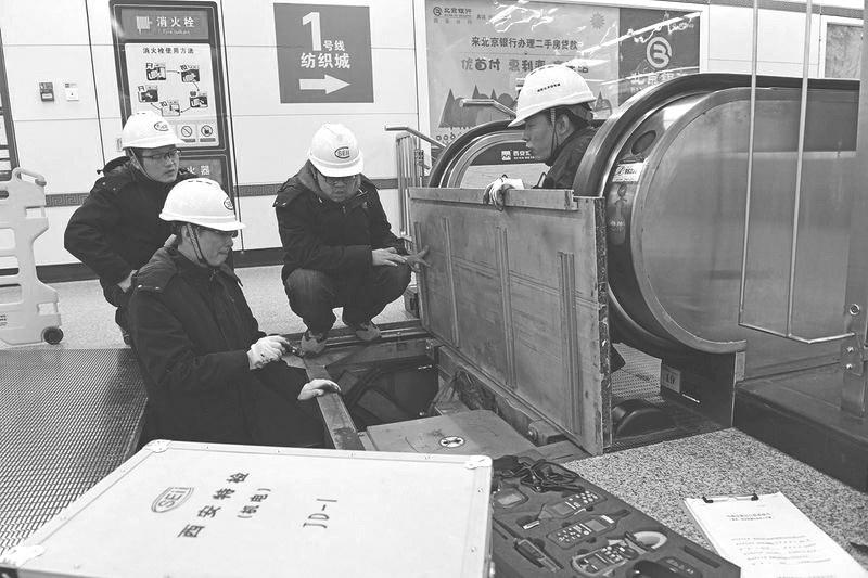 1月5日,西安特种设备检验检测院抽调技术检验人员会同相关部门,对西安地铁北大街站的二十四部自动扶梯、直梯进行年度检验。据悉,西安地铁二号线共有直梯、自动扶梯二百三十三部。检验人员将用一周时间,加班加点完成检验工作。