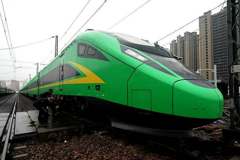 日前,被昵称为“绿巨人”的新型时速160公里动力集中动车组——CR200J型“复兴号”列车正在中国铁路上海局集团有限公司上海车辆段进行运行前的静态和动态检测。据悉,该型号动车组将在2019年春运前夕上线运行,同高铁形成优势互补,为旅客提供差异化服务。图为:1月6日,铁路员工在对CR200J动车组列车进行检测维护。