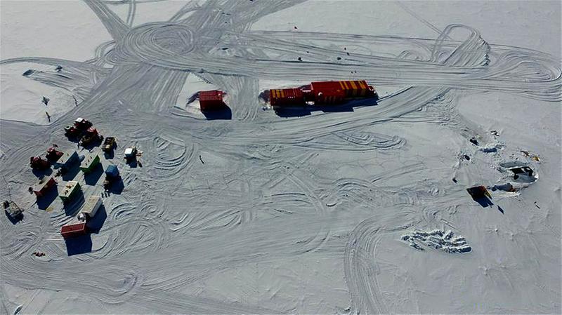 1月13日无人机拍摄的中国第35次南极科考队昆仑队营地(左)、昆仑站(中)与深冰芯房
