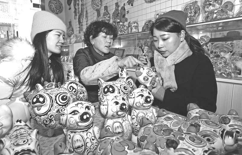 凤翔县依托县情,以凤翔泥塑的主产地六营村为中心,推动该县民间传统工艺发展,把保护非物质文化遗产、振兴传统工艺与实施乡村振兴战略有机结合。图为来自西安的两名美术专业学生在向凤翔泥塑传承人胡小红(中)学习泥塑绘画技巧。
