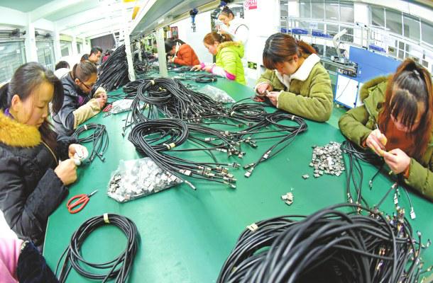 去年,安康市石泉县引进江苏一二三电子有限公司投资2000万元,在当地池河镇西苑社区设立了以生产加工数据线为主的新型社区工厂,带动社区周边600余人实现就业增收。图为移民搬迁群众正在社区工厂进行数据线材生产加工。