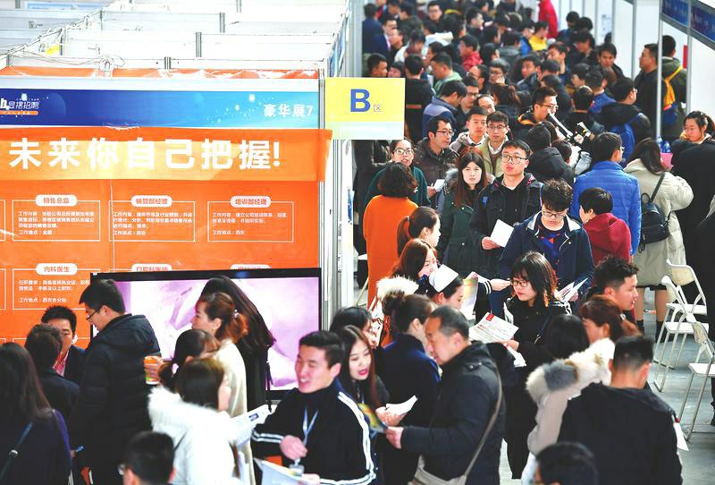 23日,2019年陕西春季大型人才招聘双选会举行,现场共设展位500余个,吸引众多求职者前来应聘。图为位于西安曲江国际会展中心的双选会主会场内人头攒动。
