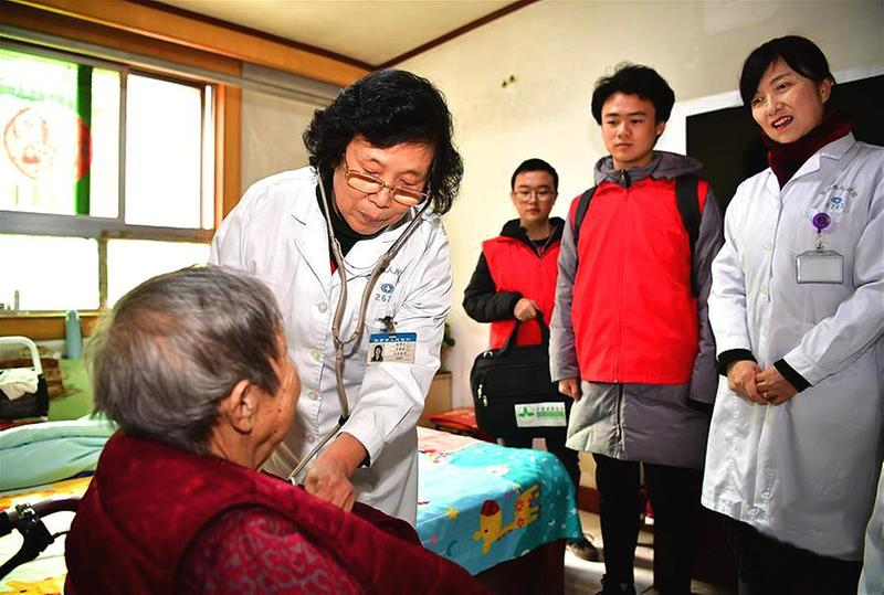 陕西省人民医院宁养院是一家免费为贫困的晚期癌症患者提供镇痛治疗、护理指导、心理舒缓等宁养服务的医疗慈善机构,该宁养院的医护人员十年如一日地出诊上门看望病人,累计为5000多名患者提供宁养服务。图为宁养院主任医师赵秀云(左二)在患者王秀菊家中为她听诊。