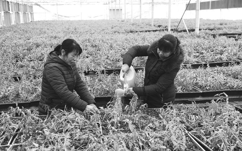 2018年,在五台街道的全力支持下,石砭峪新村合理有效地利用扶贫资金,建成了铁皮石斛种植基地2800平方米,引进移植云南铁皮石斛6.5万丛。图为西安市长安区五台街道石砭峪新村铁皮石斛种植基地,技术人员在给铁皮石斛补水。