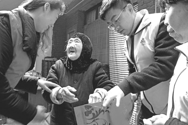 西安市莲湖区民政局、莲湖区老龄办和西安市向阳花社会工作服务中心近期开展了以“尽一份孝心,你我做得到”为主题的关爱空巢独居老人送温暖活动,现已深入72个社区,看望慰问了668位空巢独居老人。图为工作人员为95岁的王转英老太太(左二)送上慰问品。