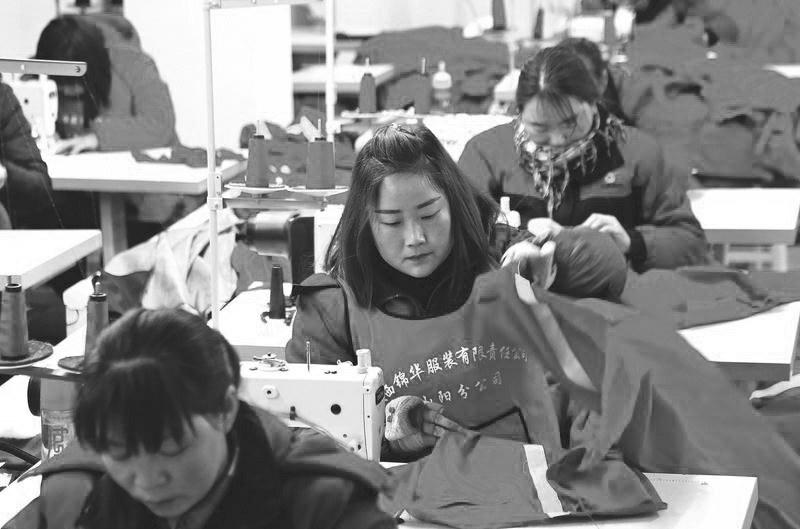 山阳县十里铺街道扶贫制衣加工厂吸纳搬迁户就地就近就业,目前务工人员有100余人,其中38人为贫困人口,每人每月平均工资2000元左右。图为工人在生产车间加工服装。