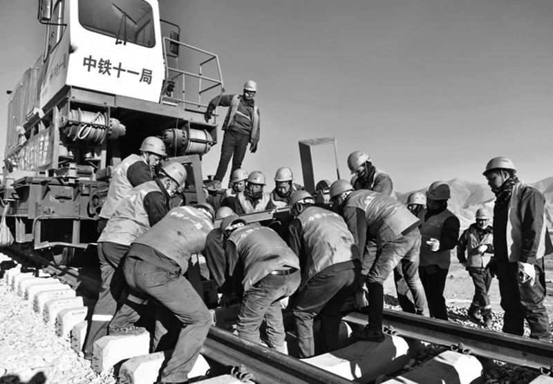3月8日,工人在铺设长钢轨前架设推送钢轨用的顺坡车。当日,拉林铁路香嘎山隧道开始铺轨,首对500米长钢轨平稳铺设在无砟道床上,为后续拉林铁路无砟轨道长轨铺设积累了经验。