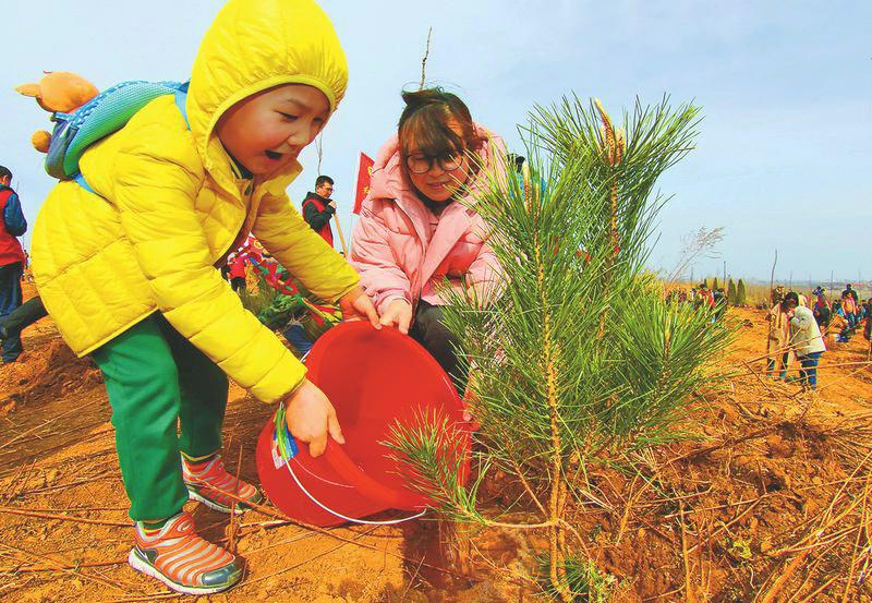 在植树节即将到来之际,人们纷纷参加植树活动,为大自然添新绿。图为3月9日,小朋友和家长在山东省烟台市牟平区一处荒山参加植树活动。