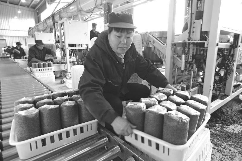 陕西和丰阳光生物科技有限责任公司制袋生产线,在山阳县高坝店镇凉水井村建设的富硒黑木耳生产基地,年生产菌袋2000万袋,安置当地劳动力100多人,其中贫困人口20人。图为该厂工人正生产黑木耳菌袋。