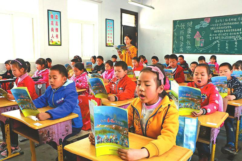去年5月,洋县编印乡土教材《七只朱鹮的故事》4.2万册,发放到全县50所中小学,供学生在思想品德课上学习,增强学生保护环境、爱护野生动植物的意识。图为洋县茅坪九年制学校二年级学生在学习乡土教材《七只朱鹮的故事》。