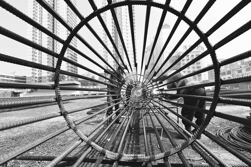 日前,西安小寨一座可容纳利用9万立方米雨水的海绵城市地下调蓄库在兴善寺东街育才中学动工。图为建设者在焊接长螺栓混凝土灌注桩的钢筋笼。