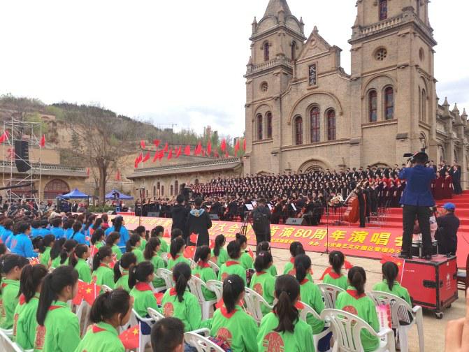 蓝天下的鲁艺旧址,红旗飘飘,歌声阵阵,《黄河大合唱》首演80周年纪念日,在这个昔日革命文艺殿堂前的广场上,由少先队员合唱团、老干部合唱团、鲁艺合唱团和宝塔合唱团共同组成的千人群众合唱队伍与台上西北民族大学合唱团、澳大利亚纳维塔黄河合唱团共同汇成歌的海洋,重现当年延安“歌咏城”盛况。《山丹丹开花红艳艳》《没有共产党就没有新中国》《我们是共产主义接班人》《歌唱祖国》《光荣与梦想》等不同时期的经典歌曲表达了延安儿女对党的无比热爱和新时代在习近平新时代中国特色社会主义思想指引下实现中国梦的豪迈情怀。