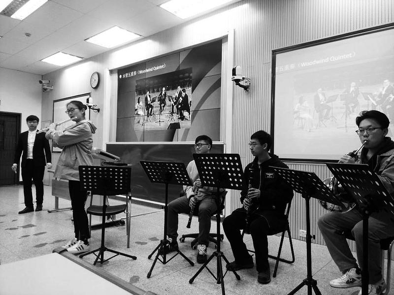 授课教师刘俊峰用风趣幽默的语言对交响乐团的组成以及常见乐器进行了详细的讲解。此次见面课特别邀请了西安交大学生交响乐团的成员,现场为同学们演奏“弦乐四重奏”和“木管五重奏”,并请乐队的每位同学用自己手中的乐器演奏音乐的片段,让在场学生辨识每一种乐器的音色及特点,迅速拉近了同学们与交响乐之间的距离。