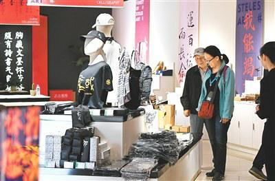 24日中午,正在店里挑选文创产品的山东游客小李说:“这里的文创挺有意思。我是学设计的,能看出来这里的很多产品都是从馆藏碑刻中汲取了设计灵感,我喜欢‘流行中国’系列。”小李在挑选喜欢的文创产品时,她的同伴王芸泷则在店里一面写有“笔墨纸砚”和相应诗句的文化墙前自拍,她说:“来之前就在网上看见别人发这里的视频和照片,当时觉得这是一家装修时尚、设计前卫的文创店。来了之后,没想到古朴厚重的碑林里还能有这么时尚的地方,既有碑林的特色,又有年轻人喜欢的元素,这种风格挺吸引我们的。”