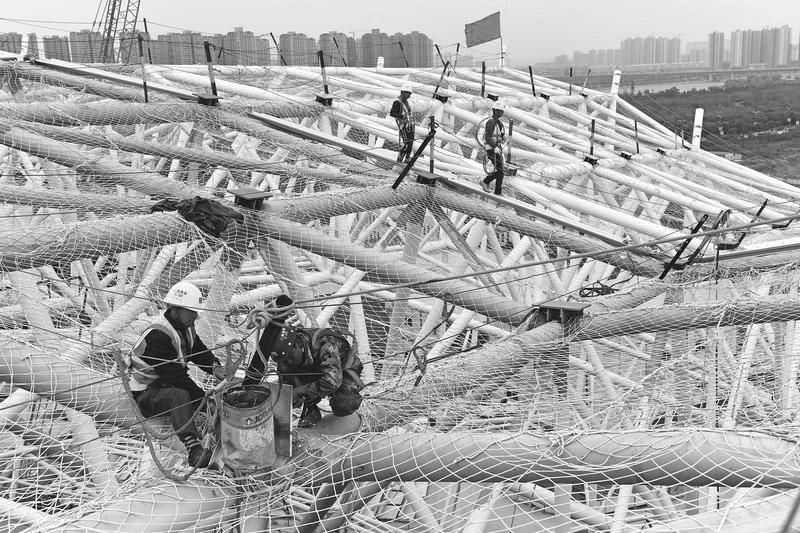 5月1日,在第十四届全运会主场馆——西安奥体中心主体育场建设工地上,中建八局600多名工人坚守岗位,进行焊接、粉刷防火涂料等作业,确保今年年底主场馆如期完工。图为建筑工人在西安奥体中心主体育场进行粉刷防火涂料作业。