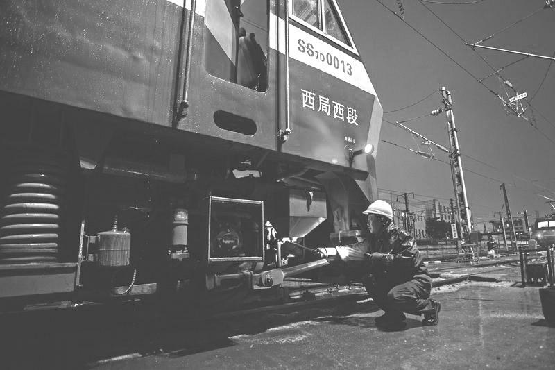 5月5日,西安机务段机车整备场,检修职工夜间冒雨检查机车撒砂装置,保证机车雨天牵引或制动时正常使用。近日,陕西大部分地区迎来持续降雨天气。中国铁路西安局集团公司西安机务段全面开展汛期隐患排查,保障旅客安全出行。