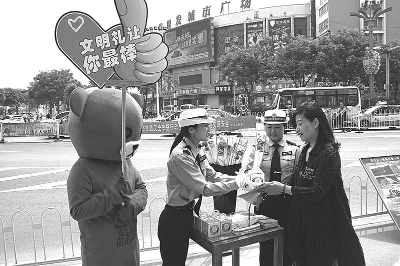 近日,渭南启动首个文明交通礼让日,全市各县(市、区)46个文明交通劝导志愿服务点同步行动。据了解,此次活动围绕创建全国文明城市的主题,倡导文明交通,旨在通过志愿者带动广大市民不断增强文明意识、安全意识和法治意识,努力营造“安全畅通、文明和谐”的道路交通环境,为城市文明注入新元素。图为民警为礼让行人的市民赠送礼物。