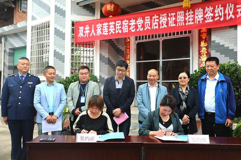 5月28日,由陕西省工业和信息化厅牵头,双井人家莲英民宿老党员店授证照、挂牌、签约仪式活动在城固县双井村隆重举行,开创了双井村“党员+贫困户”脱贫新模式。