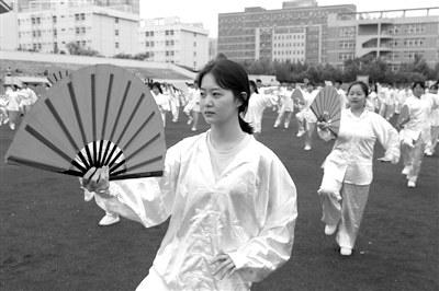 室内的活动丰富多彩,室外的表演同样精彩纷呈,白衣白裤、衣袂飘飘,八段锦、太极扇,300名学生用整齐划一的表演在操场上“武”动全场。该校体育部主任马学文表示,八段锦、太极扇是本校体育课必学项目,此外,学校还创编了孙思邈健身功法,这些都能有效促进学生身心健康。