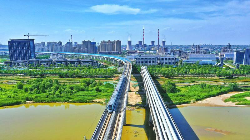 西安北至机场城际轨道项目是陕西省规划建设的第一条城际铁路项目,目前项目工程质量已通过验收,预计今年年底前通车试运营。图为列车驶过西安北至机场城际轨道项目渭河特大桥。