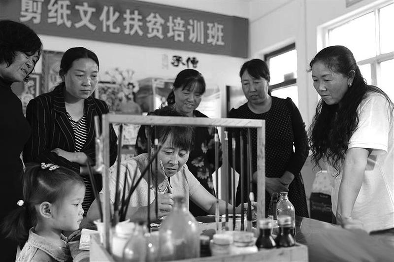 图为在富县张家湾村的巧媳妇手工艺品专业合作社内,薛爱玲向当地妇女教授熏画技艺。