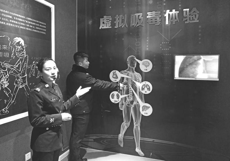 在榆林市禁毒教育基地展厅,人们可通过虚拟吸毒体验,看到人体器官吸毒后的变化和损伤。
