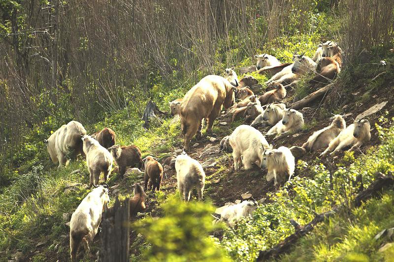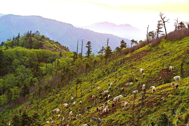 近年来,随着退耕还林、天然林保护等林业生态建设项目的实施,秦岭羚牛栖息地面积不断扩大,种群数量稳中有增。每年端午节前后,秦岭羚牛进入“恋爱季”,从四面八方迁移到秦岭高海拔地区,通常少则十几头,多则四五十头乃至上百头,组成羚牛群一起生活。图为6月8日在海拔2500米左右的秦岭高山上拍摄的羚牛群。