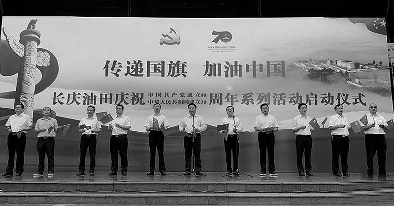 6月28日上午,493名油田党员代表、劳模代表、一线员工聚集在西安长庆油田综合办公大楼前的广场上,举行“传递国旗、加油中国”暨庆祝中国共产党成立98周年、中华人民共和国成立70周年系列活动启动仪式。