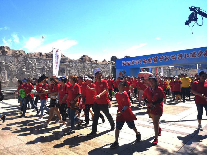 7月1日是中国共产党98岁生日,上午10时,“与祖国同行”陕西省百万职工网上健步走活动线下启动仪式在西安汉城湖畔举行。