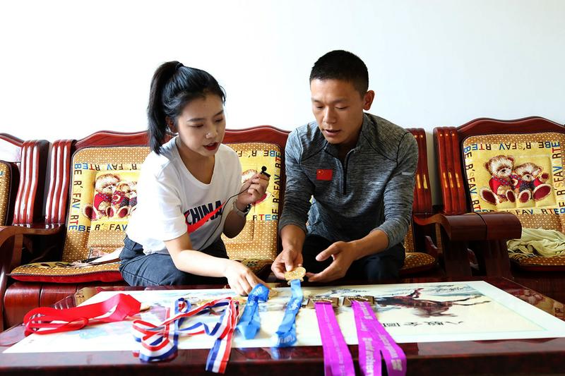 王思俊(右)正在向记者介绍自己获得的荣誉 本