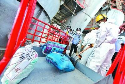 8日,记者在昌平区金隅北水环保科技有限公司现场看到,这些毒品已被分门别类,一箱箱装好,贴好封条,数名特警持枪站岗,现场民警将一箱箱毒品从车内搬出,工作人员则戴上口罩、手套,将毒品搬上高处的2700℃的高温炉内焚烧。