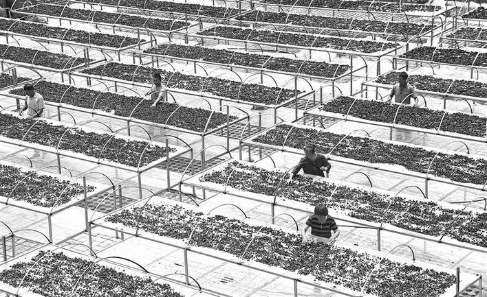 柞水县下梁镇西川村发展木耳产业助农增收。目前已建成吊袋大棚105个,生产吊袋木耳100万袋,每袋利润1元至1.5元。图为该村村民在晾晒木耳。