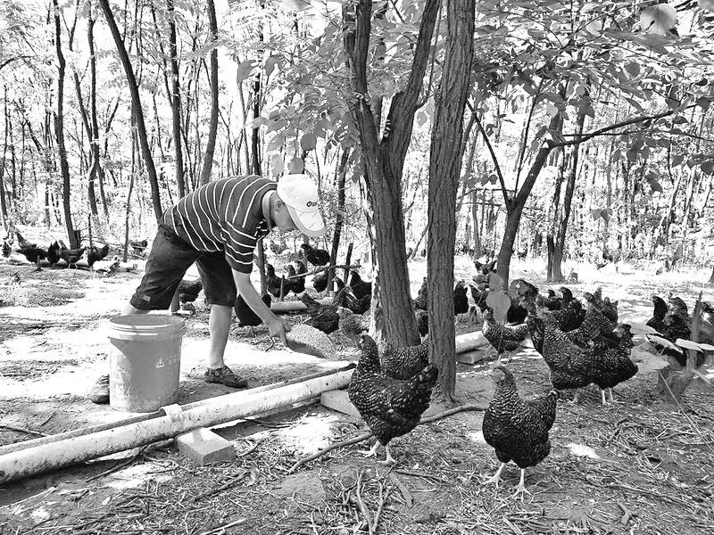 近年来,永寿县依托槐林绿色资源优势,大力发展林下养鸡,拓宽农民增收渠道。图为7月6日永寿县五凤生态种养专业合作社工作人员正在给芦花鸡喂食。