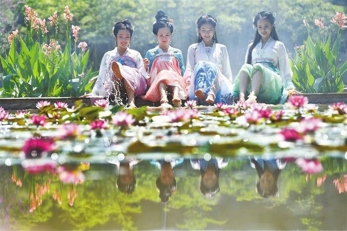 7月14日,在沣东荷苑,游人戏水赏睡莲。当日,位于西咸新区沣东新城斗门街道办普贤寺村的荷苑,上百亩荷塘的600多种荷花竞相绽放,吸引众多游人前来观赏。