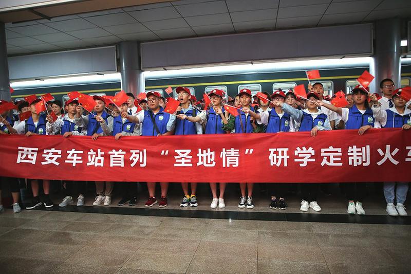 7月17日上午,陕西首趟“圣地情”红色文化研学班列开行,来自甘肃张掖民乐一中、山丹一中的118名学生,乘坐西安至延安K8162次“圣地情”红色文化研学班列,从西安车站出发前往中国红色革命圣地——延安,开始研学之旅。