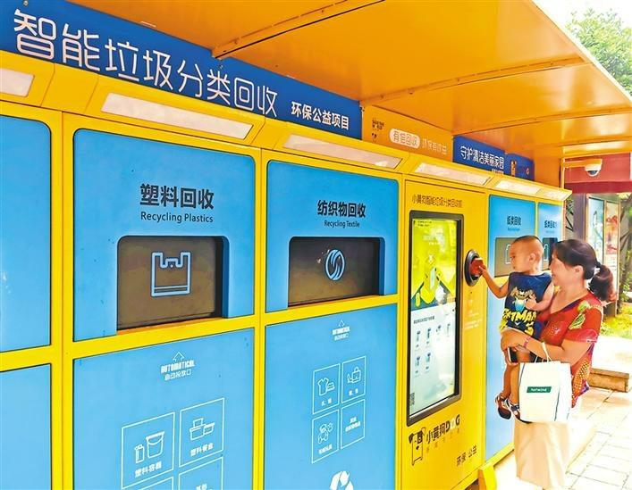 近日,在西安市新城区一家小区内,市民正在将垃圾投放到智能垃圾回收机内。据悉,市民可通过手机扫描回收机上的二维码,将垃圾分类投放。