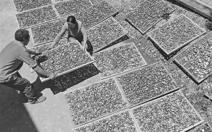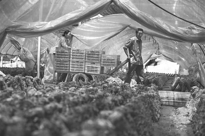 沙坝村香菇产业基地自2014年建设至今,通过不断探索,改革创新,逐步建立了统一生产袋料、统一提供技术指导、统一销售,分散管理的“三统一分”发展模式。得益于党的好政策,王顺材由以前为别人打工到现在自己当起了老板。图为在留坝县马道镇沙坝村的香菇产业基地里,王顺材和媳妇周凤莲正在采摘香菇。