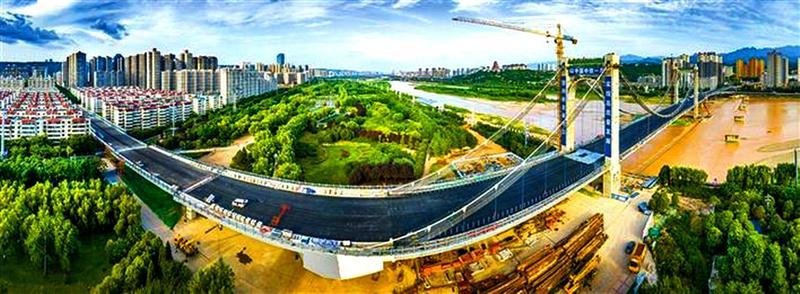 宝鸡联盟路渭河大桥是渭河陕西境内同类桥梁中跨径最大的悬索桥,也是西北地区首座双索面自锚式悬索桥,全长约一点四公里,建成后将成为宝鸡市区的地标性建筑。截至目前,桥梁形象进度完成总工程量的百分之九十五,计划八月底完工。图为建设中的宝鸡联盟路渭河大桥。