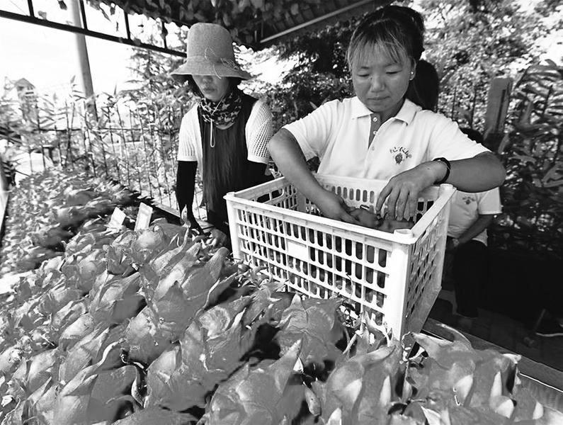 西安市阎良区近年来积极探索农业转型升级,于2016年成立火龙果专业合作社,开展火龙果种植销售及育苗推广,推进农业观光园和生态采摘园建设。经过3年的发展,阎良区火龙果种植面积已达300亩,每亩年收入突破3万元,有效带动当地群众致富增收。图为工作人员(右)在帮选购火龙果的顾客装箱。