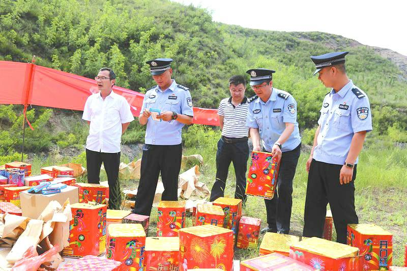 7月25日上午,渭南市合阳县公安局协同应急管理局在百良镇李家河沟一空地上,集中销毁了300余件价值3万余元的非法烟花爆竹产品。