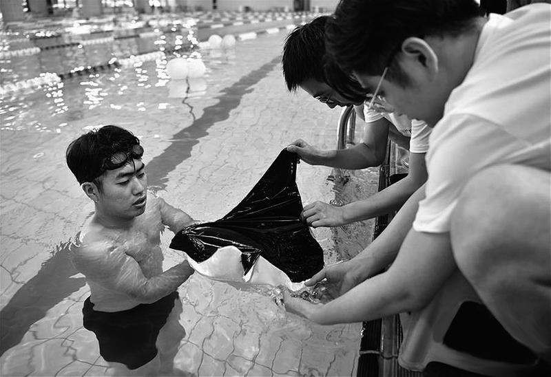 日前,由西北工业大学牵头研制的滑扑一体自主变形仿生柔体潜航器在西安成功首航,这是我国首款滑扑一体自主变形仿生柔体潜航器。自主变形仿生柔体潜航器项目以蝠鲼为仿生原型,将具备高推进效率、高机动性、高稳定性、低环境扰动、低噪音,以及大负载空间、大负载能力、海底软着陆等特点。图为学生给原理验证样机装上蒙皮。