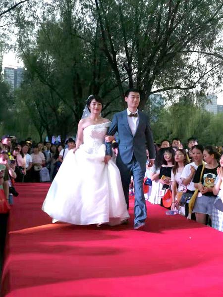 城市运动公园浅水湾的舞台上,十对在往期工会联谊活动中结缘的青年职工夫妇,再次穿上婚纱礼服上台和众人一起分享快乐、重温他们的幸福时刻。