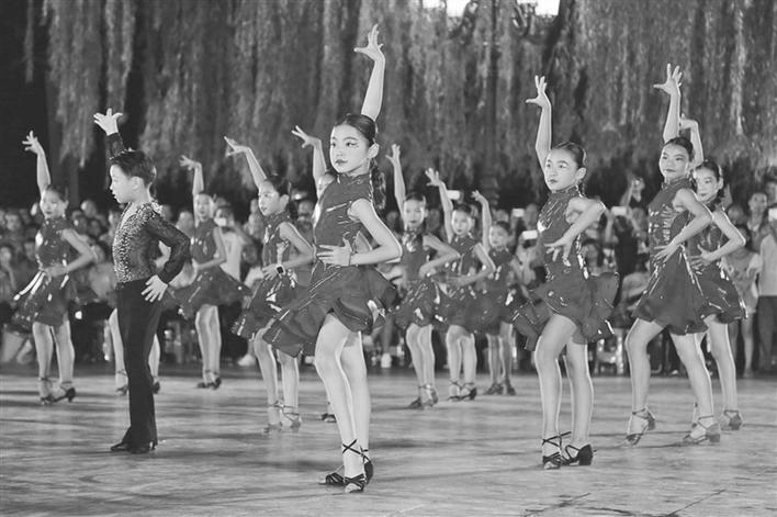 8月8日是全国第十一个“全民健身日”。8月6日晚,陕西省全民健身日主会场暨西安市全民健身月启动仪式在西安青龙寺遗址公园举行。图为西安的小选手展示国际标准舞。