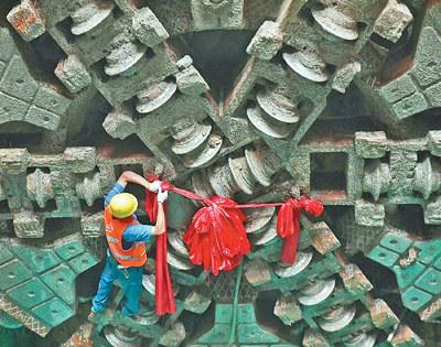 8月12日,由中国交通建设股份有限公司承建的深圳地铁8号线一期工程深盐(深外高中站—盐田路站)盾构区间左线顺利贯通,全线预计明年开通初期运营。图为施工人员在盾构机上挂红绸带庆贺贯通。