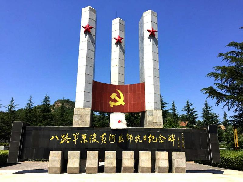 一座纪念碑 铭刻红色记忆 在韩城市东南芝川镇“八路军东渡黄河出师抗日纪念碑”矗立在凤凰台半山腰上,纪念碑由三片高大的竖向碑体和八个船形基座组成,寓意1937年9月扬帆东渡的八路军和艰辛的八年抗战。