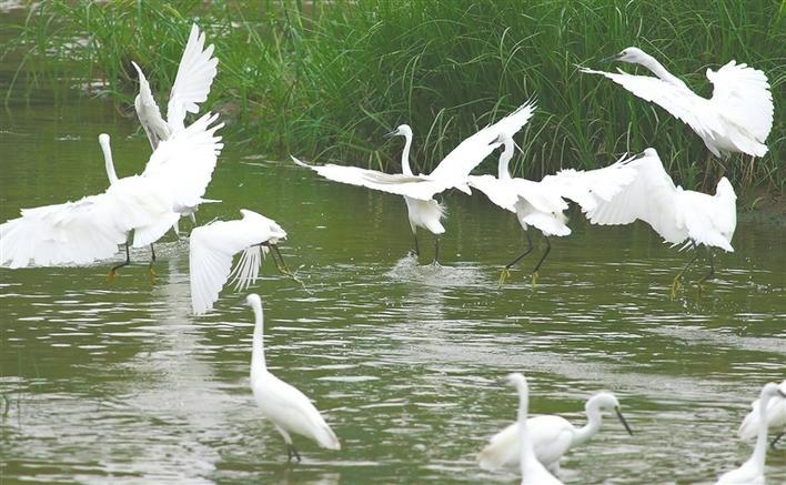 8月20日,上百只白鹭在西安浐灞生态区浐河桃花潭公园或跳跃起舞,或低头觅食,或悠然站立,形成了一幅美丽和谐的生态画卷。近年来,经过治理后的浐河绿树成荫,河道宽广,河边芦苇依依,景色优美,尤其是水质得到明显改善,非常适合白鹭、苍鹭等野生水鸟生活。