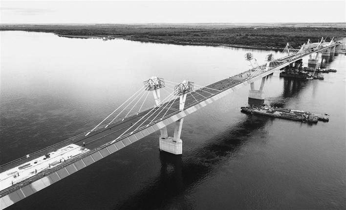 正在进行桥面铺装施工作业的黑河到布拉戈维申斯克黑龙江(阿穆尔河)大桥(八月十九日无人机拍摄)